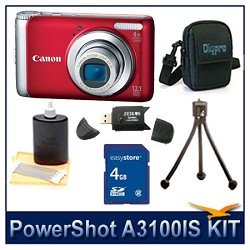 Canon PowerShot A3100 IS Digital Camera (Red), 12.1 MP, 4x Optical Zoom, 2.7" LCD Display, Digpro Deluxe Carrying Case, 3pc. Lens Cleaning Kit, 4 GB Memory Card, Hi-Speed SD USB 2.0 Card Reader, Mini Tripod Review