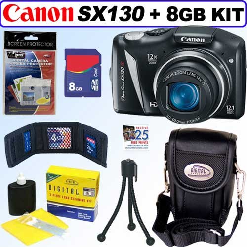 Smart, sleek and creative, the PowerShot SX130 IS is the perfect companion to all your good times. Now you can capture every detail of special moments in crisp, stunning 720p HD - even while using the high-powered 12x Wide-Angle Optical Zoom! You'll record in stereo sound, then play back your videos instantly on you computer. The SX130 IS is all about creativity, with fun new scene modes like Miniature Effect for Movies, and Fisheye Effect for artistically distorted stills. While you're having fun creating, the camera's Smart Flash Exposure and advanced Smart AUTO systems are ensuring that every image is the best it can be. Add the DIGIC 4 Image Processor, 12.1 Megapixels and Canon's Optical Image Stabilizer, and you've got the ideal camera for making the good times last.++PLUS++ 8GB Accessory Kit: 8 Gigabyte SD Secure Digital Memory Card - Universal Memory Card Wallet - Digital Camera Carrying Case with Pocket & Strap - Lens Care & Cleaning Kit - LCD Screen Protectors - Flexible Mini Tripod - BONUS!! FREE 25 Quality Prints.