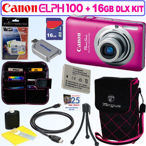 Canon PowerShot ELPH 100 HS features: * Canon's HS SYSTEM with a 12.1 MP CMOS and DIGIC 4 Image Processor improves shooting in low-light situations without the need for a flash and * Full 1080p HD Video for exceptional quality and keep footage stabilized with Dynamic IS. * Get high-speed shooting in a point-and-shoot camera: High-speed Burst Mode captures 8.2fps and * Smart AUTO intelligently selects the proper settings for the camera based on 32 predefined shooting situations. * 4x Optical Zoom with a Wide-Angle lens (28-112mm) Optical Image Stabilizer and a 3.0-inch PureColor System LCD. * Lowers noise levels at higher ISO settings. * Super Slow Motion Movie records video at high speeds to allow slow motion playback.++PLUS++ 16GB Deluxe Accessory Kit: 16 Gigabyte SDHC Secure Digital Memory Card - Secure Digital USB Card Reader - Pretty 6 Pocket Memory Card Wallet - Spare NB-4L Rechargeable Lithium ion Replacement Battery - Pretty Digital Camera Carrying Case w/Inner Pocket, Mirror & Strap - Lens Care & Cleaning Kit - Package of LCD Screen Protectors - Flexible Legged Mini Table Tripod - BONUS!! Mini HDMI male to standard HDMI male cable for direct connection to a high-definition TV monitor - FREE 25 Quality Prints (promo code# on invoice).