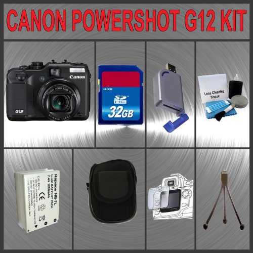 Canon PowerShot G12 Digital Camera + Huge Accessories Package Including 32GB SDHC Memory Card + NB-7L Extra Replacement Li-ion Battery Pack + Hi-Speed SD Card Reader + Carrying Case + Table Top Tripod + Lens Cleaning Kit + LCD Screen Protectors Kit Feature