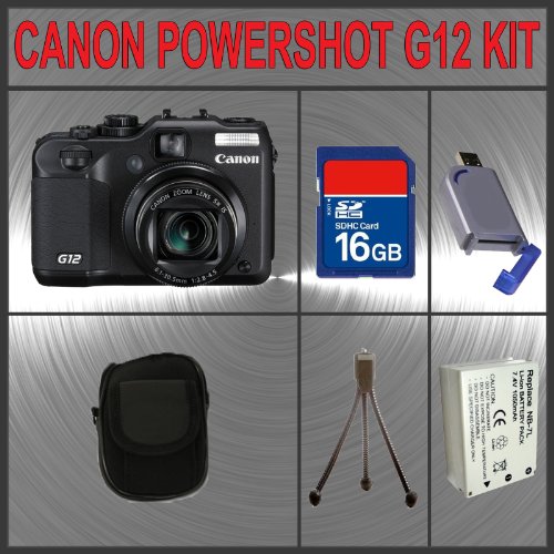 Canon PowerShot G12 Digital Camera + Huge Accessories Package Including 16GB SDHC Memory Card + NB-7L Extra Replacement Li-ion Battery Pack + Hi-Speed SD Card Reader + Carrying Case + Table Top Tripod Kit Overview